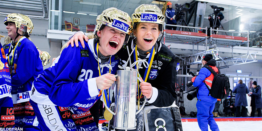 Tilda Ström till vänster... här efter guldet med Villa 2021 - nu tillbaka i SAIK där hon gör Succé!