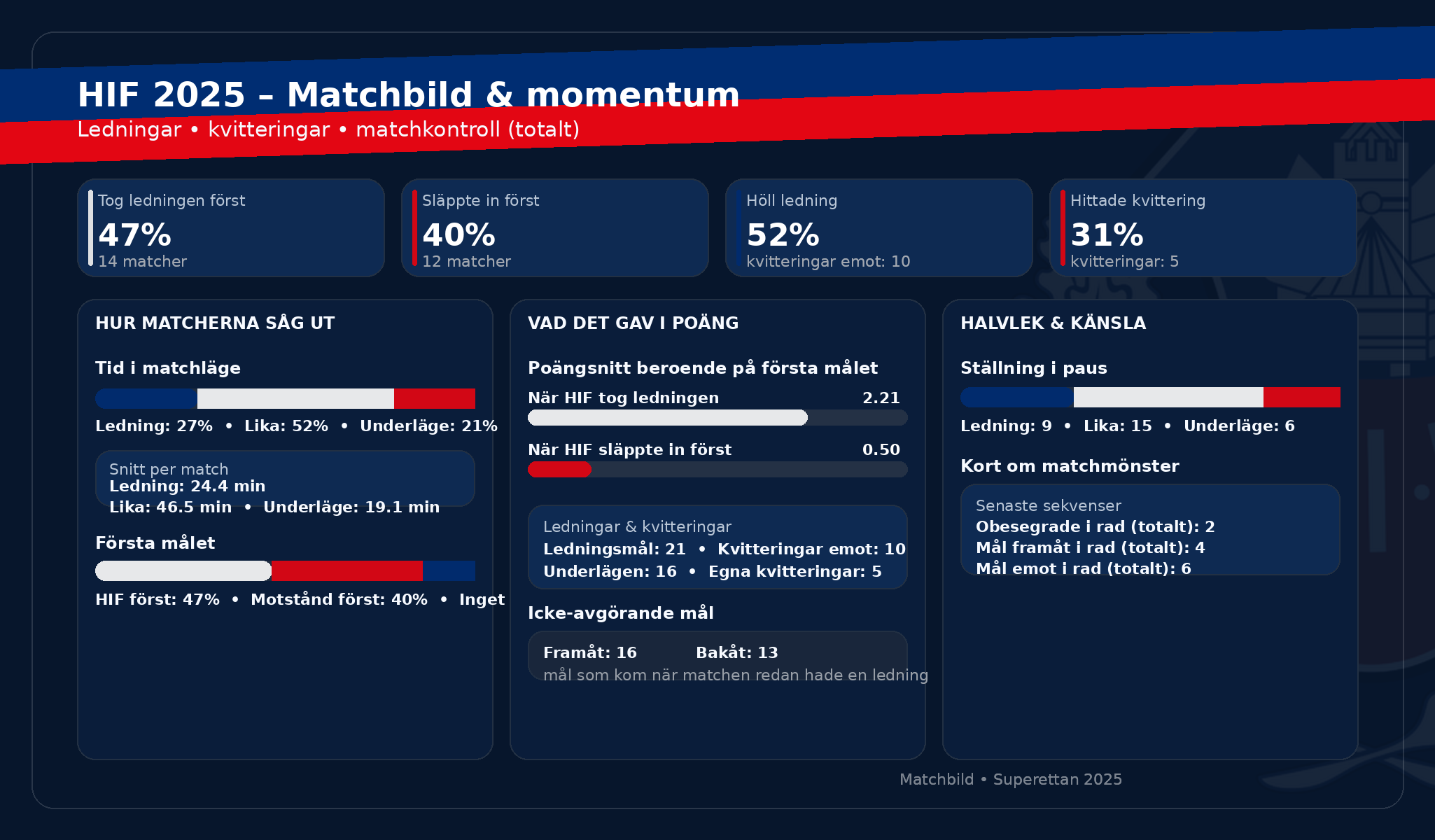 HIF:s matcher 2025 såg ofta likadana ut: ganska jämna, ganska mycket “tillbaka till ruta ett”, och sällan total kontroll åt något håll. Man låg mycket i läget där allt var öppet. Inte kaos, men heller inte att man styrde matcherna som ett topplag.