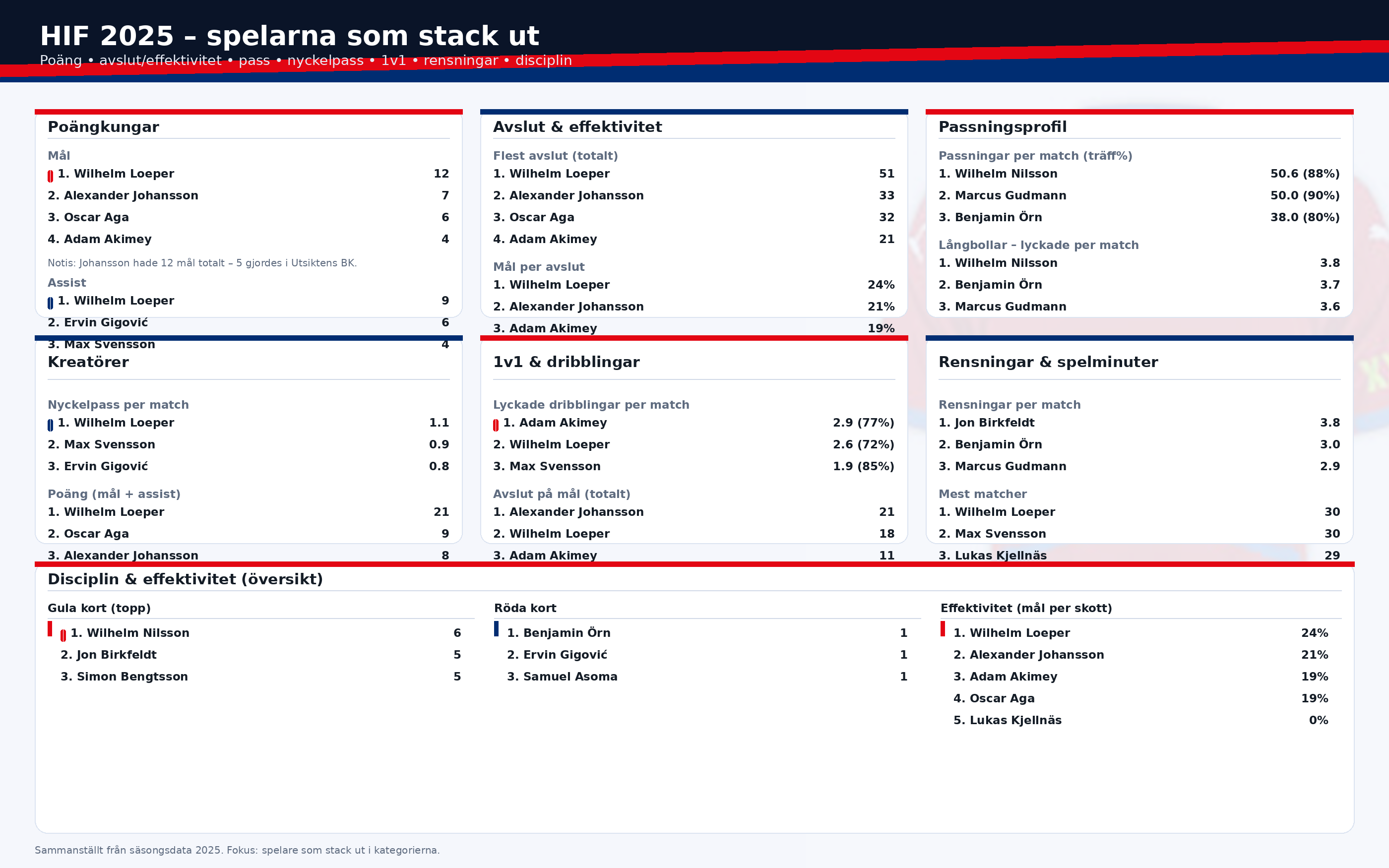 Wilhelm Loeper var den stora motorn offensivt – han gjorde poäng, skapade chanser och var ofta den som fick HIF att se farliga ut. Alexander Johansson hamnar också högt i målkolumnen, men där ska man komma ihåg att fem av hans tolv mål kom i Utsikten – i HIF var han mer en stabil målskytt än en dominant.