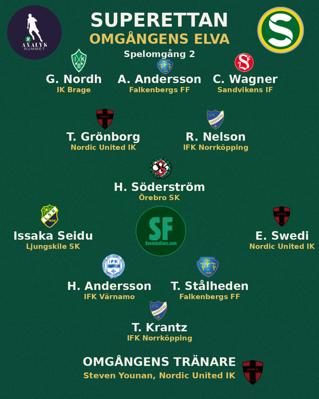 Det blev totalt 24 mål när Superettans andra omgång spelades färdigt – och som vanligt gott om berättelser att bära med sig vidare. Vi fick bland annat bevittna ett sent avgörande på Landskrona IP, en historisk hemmaseger för Nordic United, fyra mål på Jernvallen och sju i Borlänge. Mitt i allt det där fanns spelarna som satte tydligast avtryck. Här är spelarna som tog sig in i vår elva.
