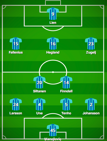 Högre upp i banan är det svårare att förutse, Matias Siltanen som sittande mittfältare och Kristian Lien längst fram känns helt givna. På ytterpositionerna gjorde nästan alla mål senast. Hattrick från Nino Zugelj, två mål från Oskar Fallenius och både mål och assist från Jeppe Okkels. Dessutom finns möjligheten att Bo Hegland kan ta en tröja där beroende på hur Honkavaara vill göra centralt. Då står det mellan det danske nyförvärvet Peter Langhoff, en förra veckan imponerande Hampus Finndell samt Patric Åslund. Frågorna är många och svaren är än så länge få. Med Andersson out tror undertecknad på ett mittfält och en anfallsuppställning identisk med förra veckan med Siltanen och Finndell strax bakom Hegland och firma Zugelj - Fallenius på varsin sida anfallare Lien.