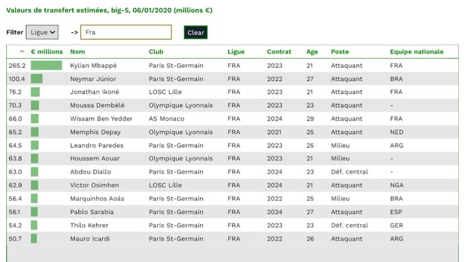 Här är CIES värderingar på spelare i Ligue1 som är värda mer än 50 m€!